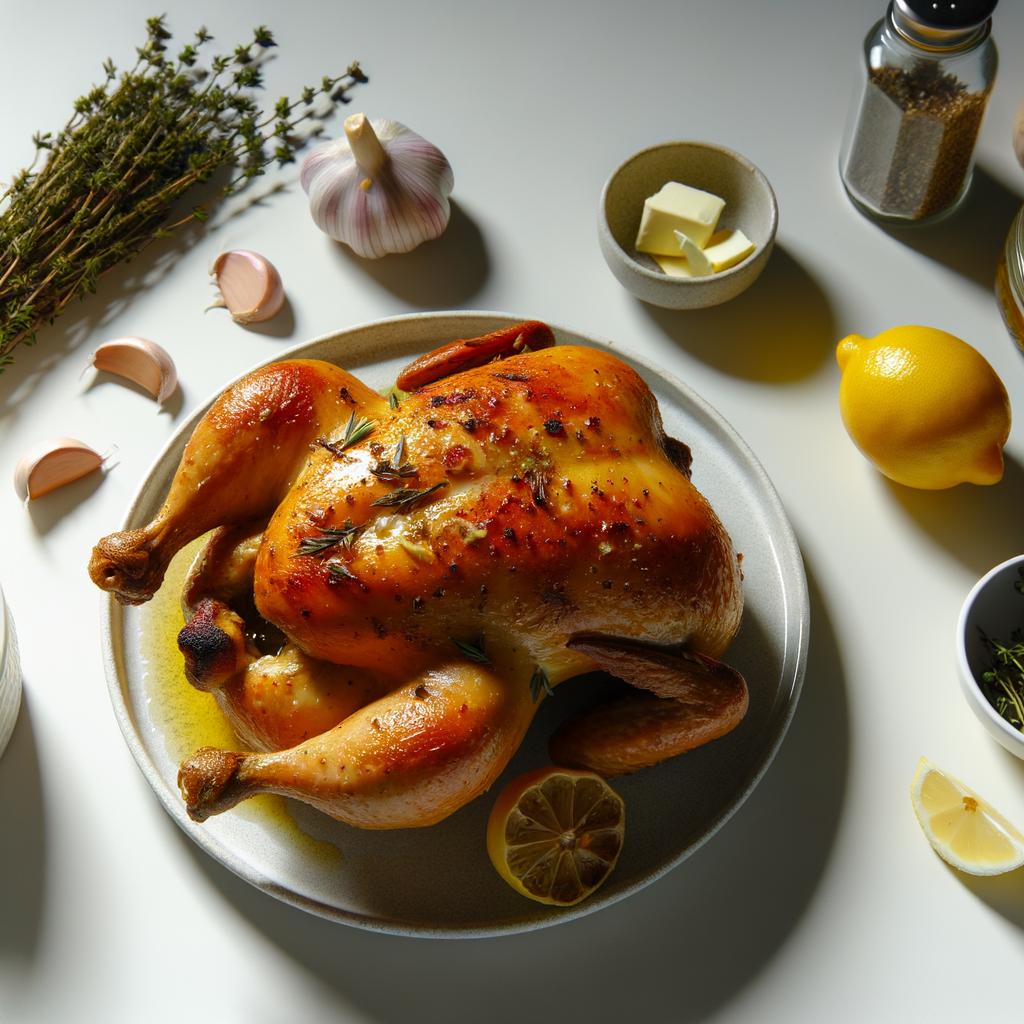 The succulent aromas of garlic and herbs infuse this whole roasted chicken, making it an irresistible centerpiece for your dining table. The butter mixture ensures a juicy interior and crispy, golden skin that's sure to impress both family and guests.