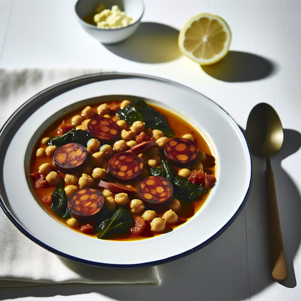 Glossy slices of browned chorizo mingle with tender chickpeas in a bright tomato broth studded with wilted spinach and lemon. The stew has a pleasing contrast of smoky, salty sausage, warm paprika, and a touch of heat from red pepper flakes, finished with fresh parsley for brightness.