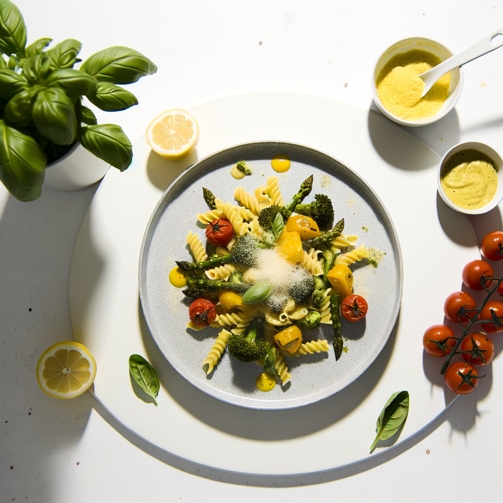 Bright, tender-roasted vegetables and al dente pasta are coated in a silky lemon-basil cream that balances richness with citrusy lift. Roasted cherry tomatoes blister and bell peppers caramelize while broccoli and asparagus keep a pleasant bite, giving the dish varied textures and pops of color.