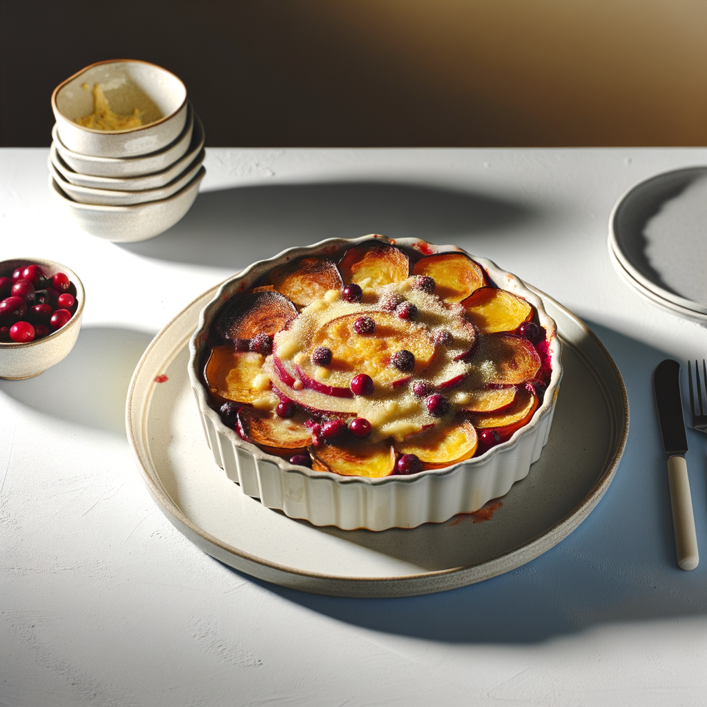 Silky, lightly browned layers of tender root vegetables contrast with pops of chewy tart fruit and a golden, bubbling cheese topping. Thin slices become fork-tender after a quick simmer and a short bake, forming a visually pretty casserole with caramelized edges and a creamy, slightly sweet sauce.