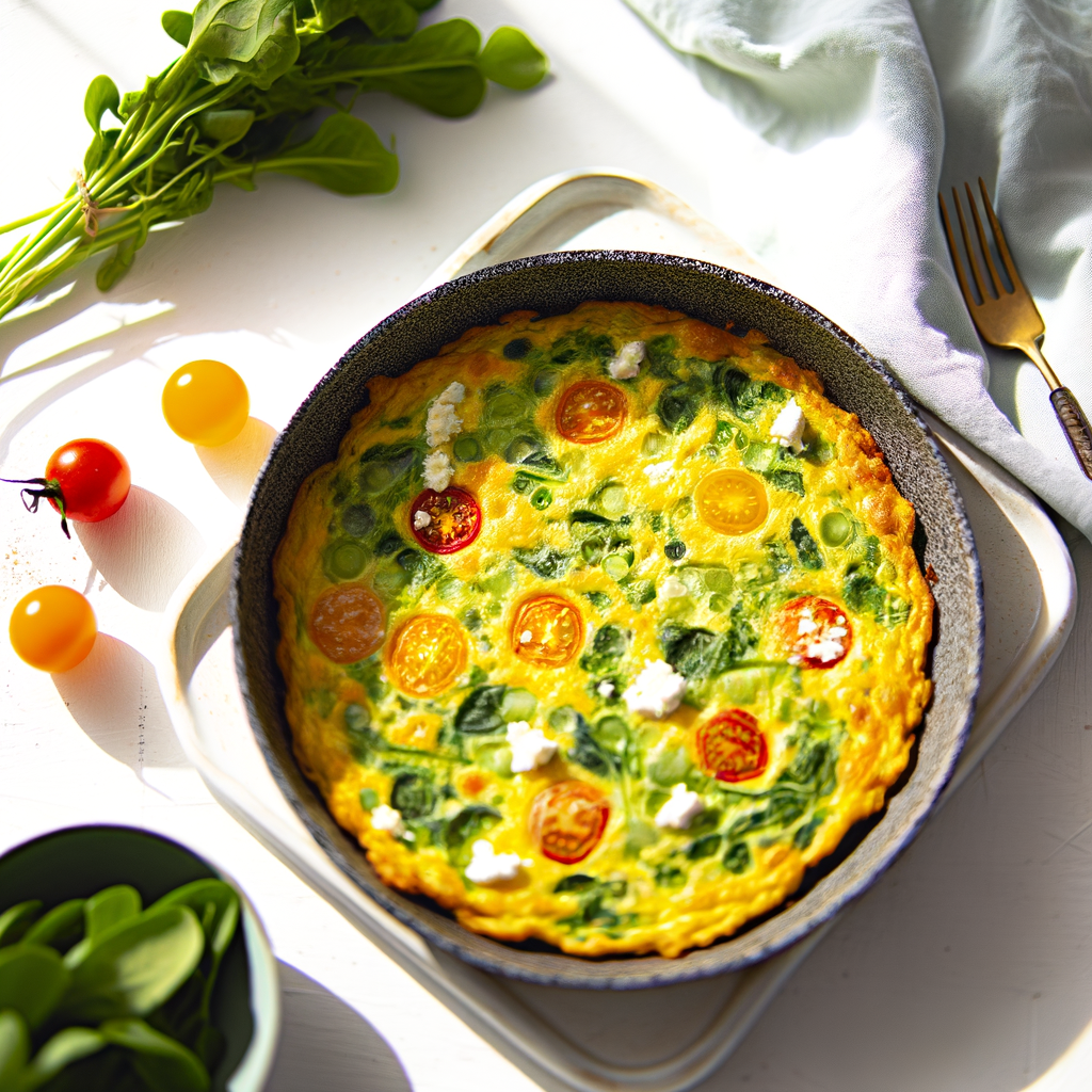 Bright, tender vegetable bites and creamy eggs set into a golden, slightly puffed pan-baked frittata combine fresh textures and a pop of briny feta. The top browns lightly under the broiler while the center stays silky, making for attractive slices that hold together for easy serving.