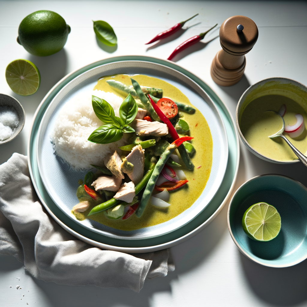 Discover the vibrant flavors of Thai cuisine with this Thai green curry. It’s a harmonious blend of fragrant herbs, creamy coconut milk, and tender chicken. This dish is perfect for those who enjoy a bit of spice and want to experience the exotic tastes of Southeast Asian food at home.