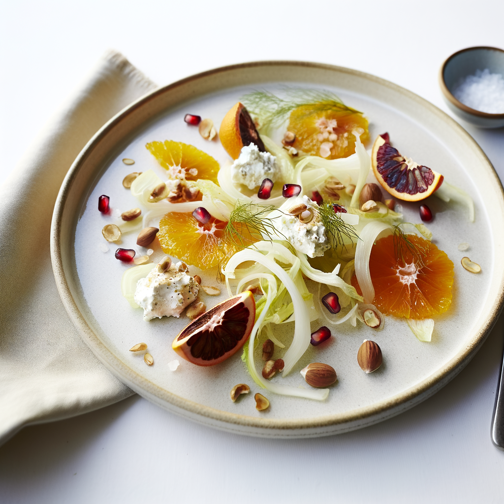 Crunchy shaved fennel and juicy citrus segments contrast with pillowy whipped goat cheese and jewel-like pomegranate seeds for a salad that sings of winter freshness. The salad balances crisp textures, bright acidity, and creamy tang, while toasted hazelnuts add warm nutty crunch and a dusting of flaky salt brings each bite into focus.